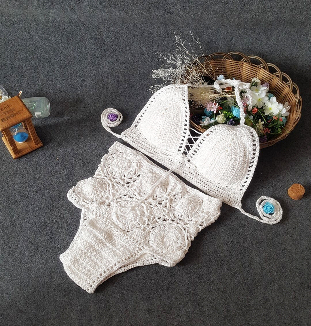 European and American foreign trade new high waisted swimsuit color crochet hook flower lady hollow split bikinis suit